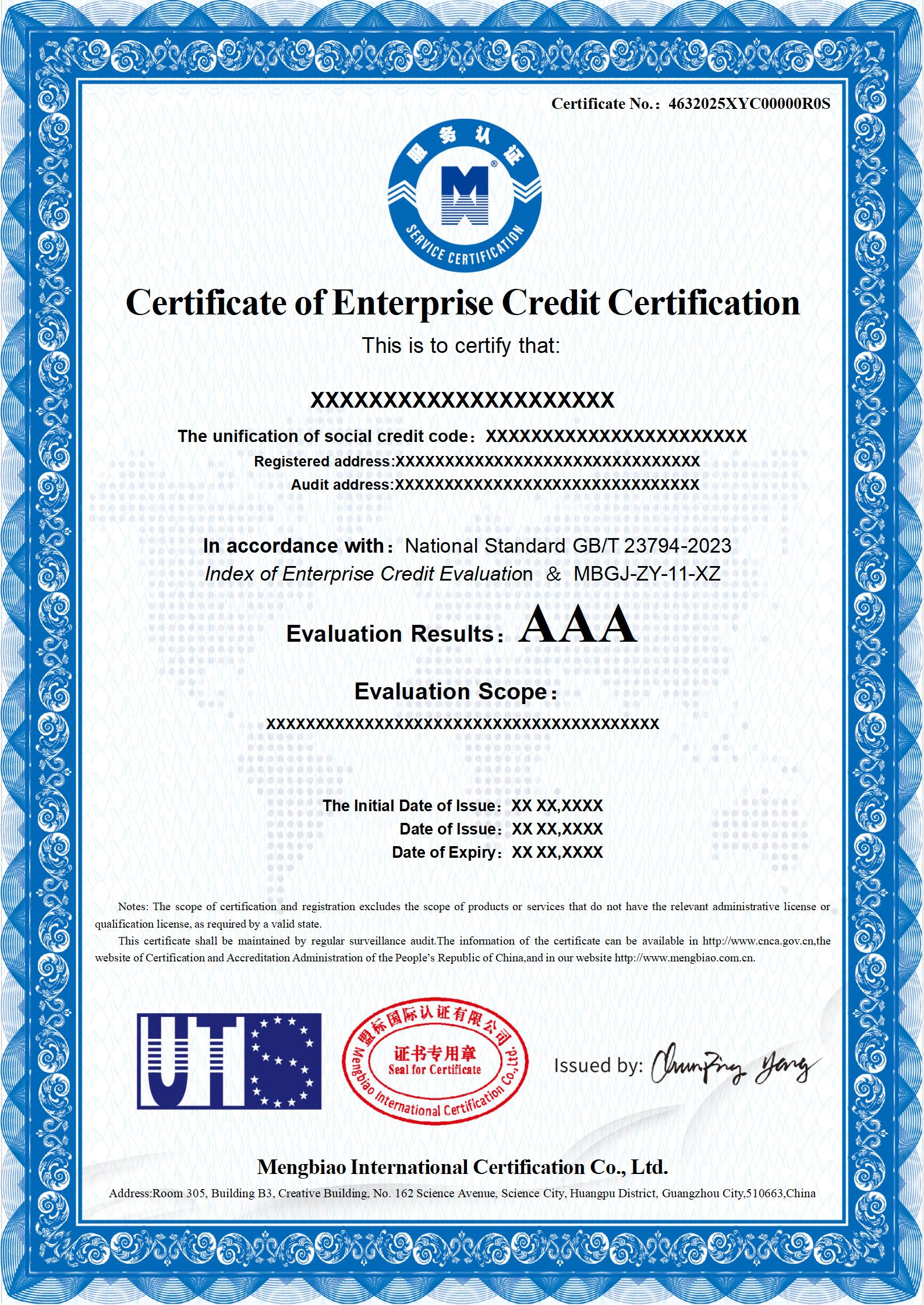 企業(yè)信用認(rèn)證證書——英文版證書