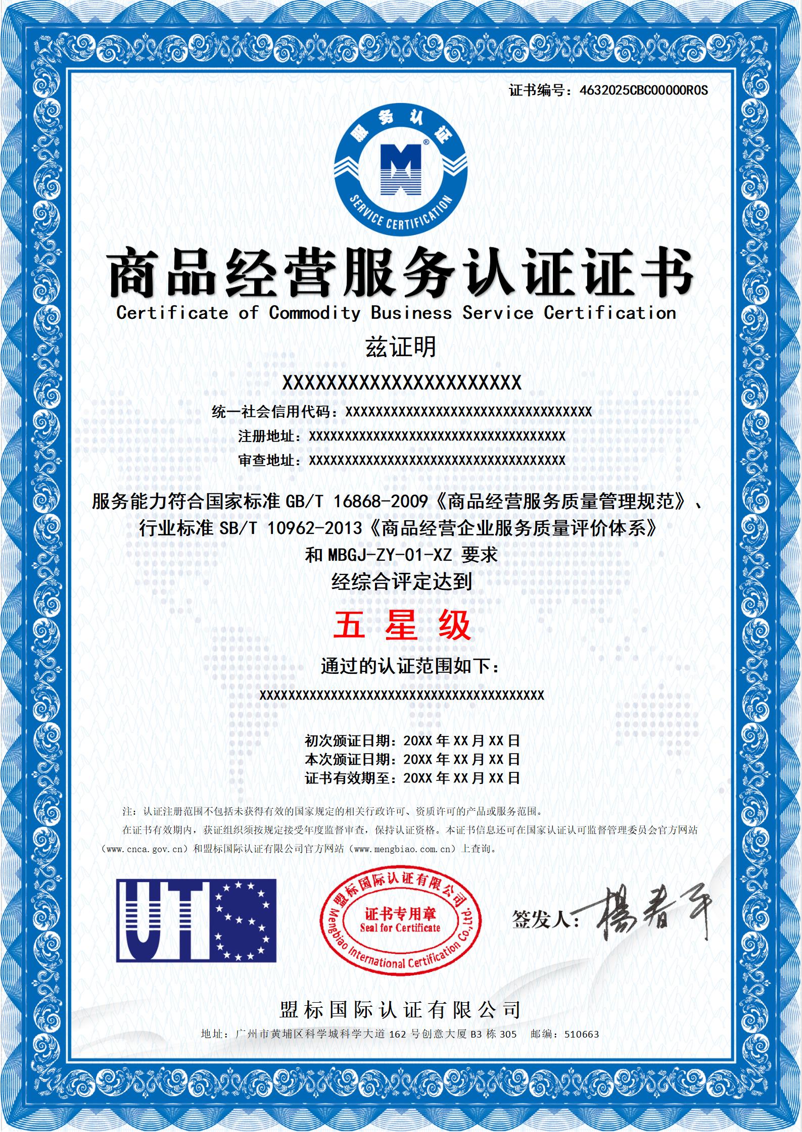 商品經(jīng)營服務(wù)認(rèn)證證書-樣版