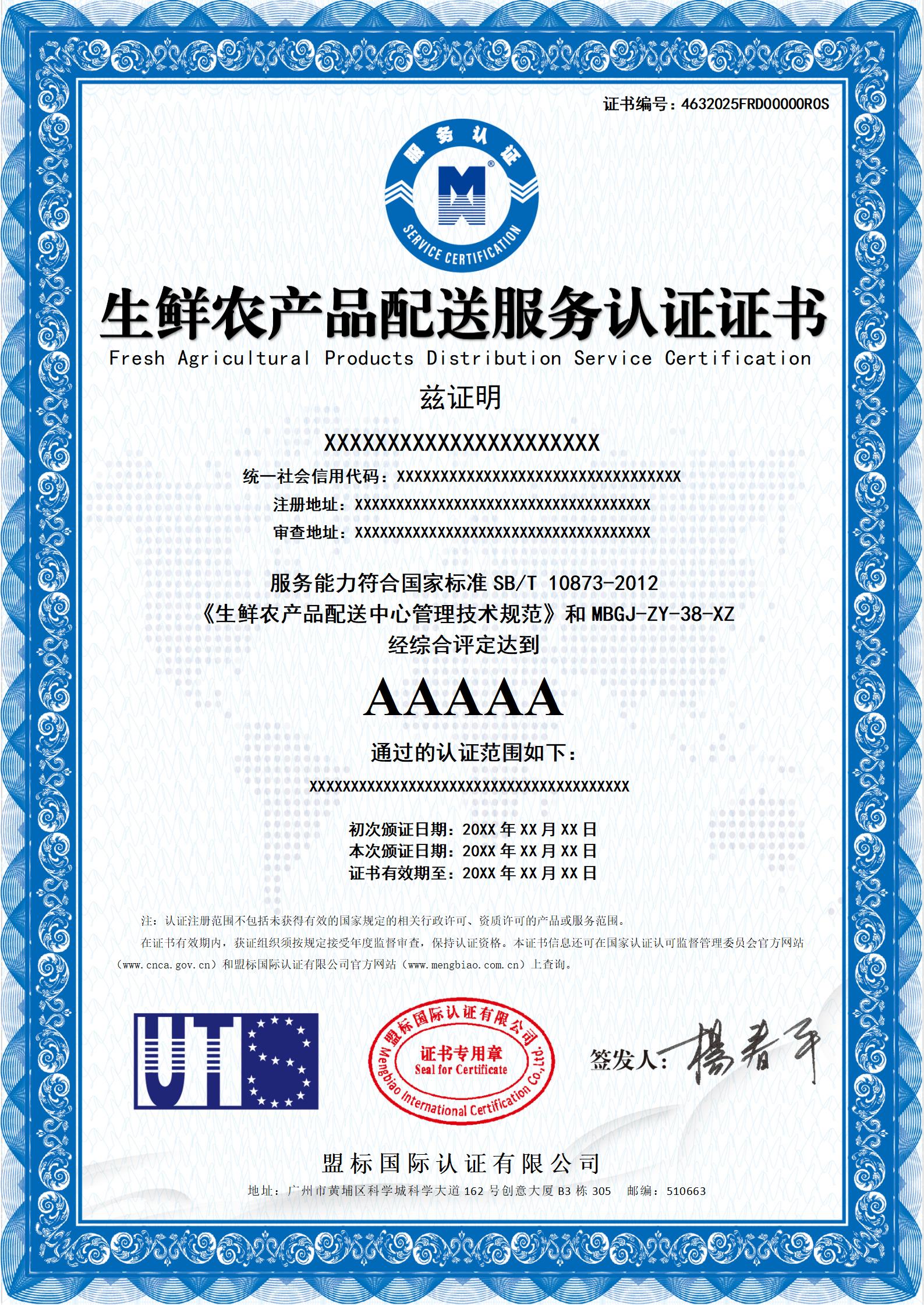 生鮮農(nóng)產(chǎn)品配送服務(wù)認(rèn)證證書-樣版