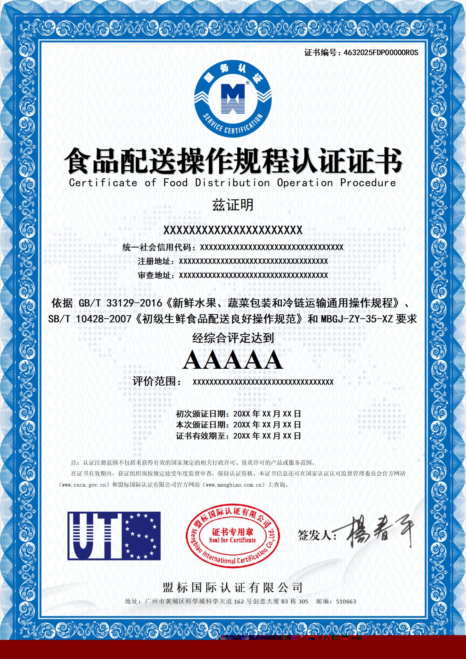 食品配送操作規(guī)程認(rèn)證證書-樣版