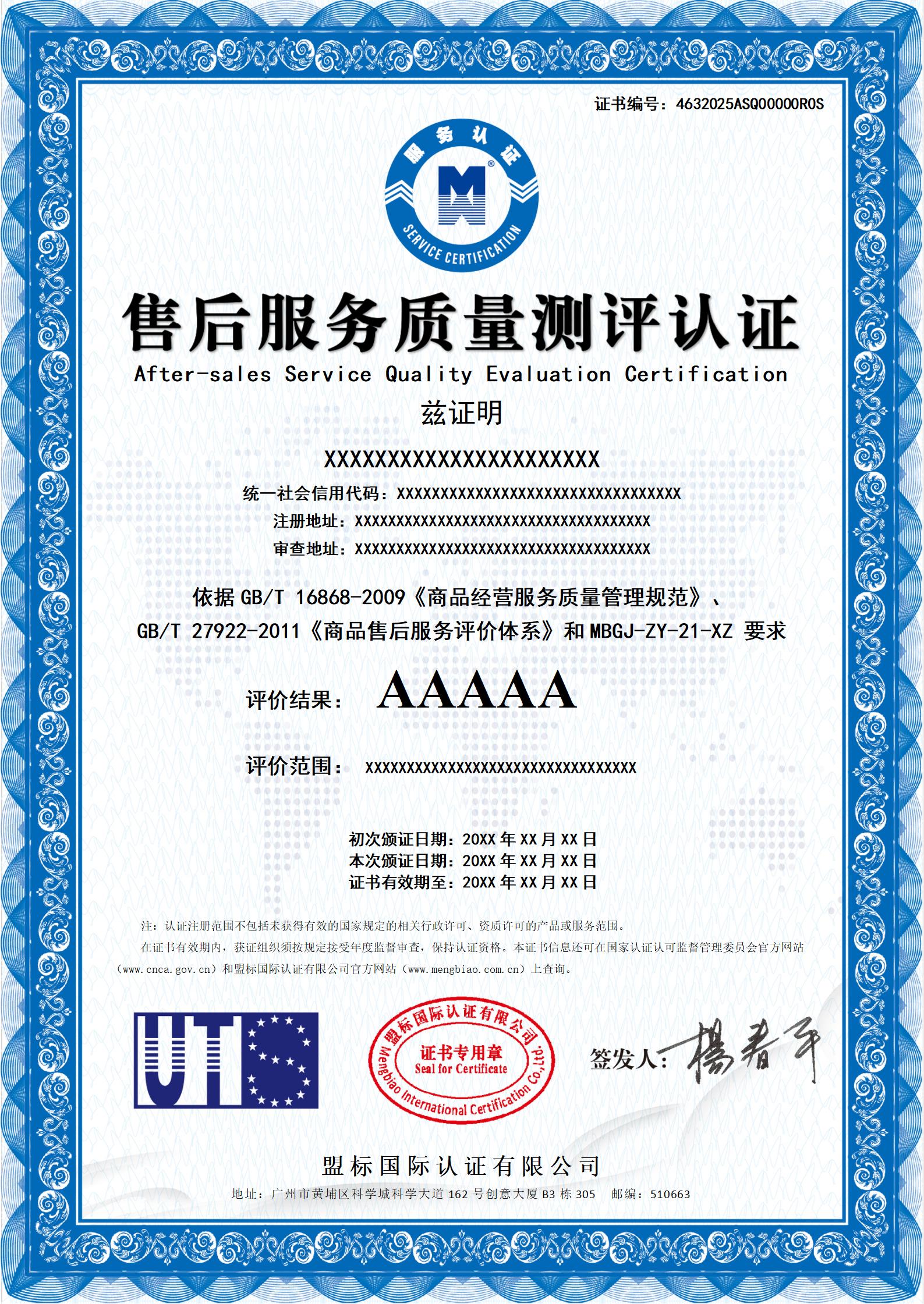 售后服務(wù)質(zhì)量測評(píng)認(rèn)證證書-樣版