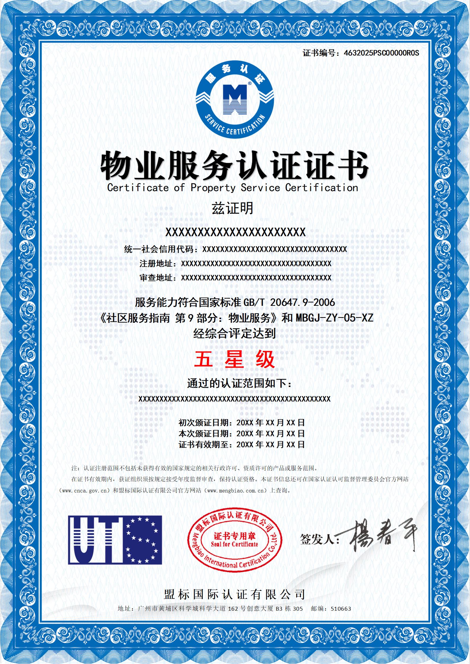 物業(yè)服務(wù)認(rèn)證證書-樣版
